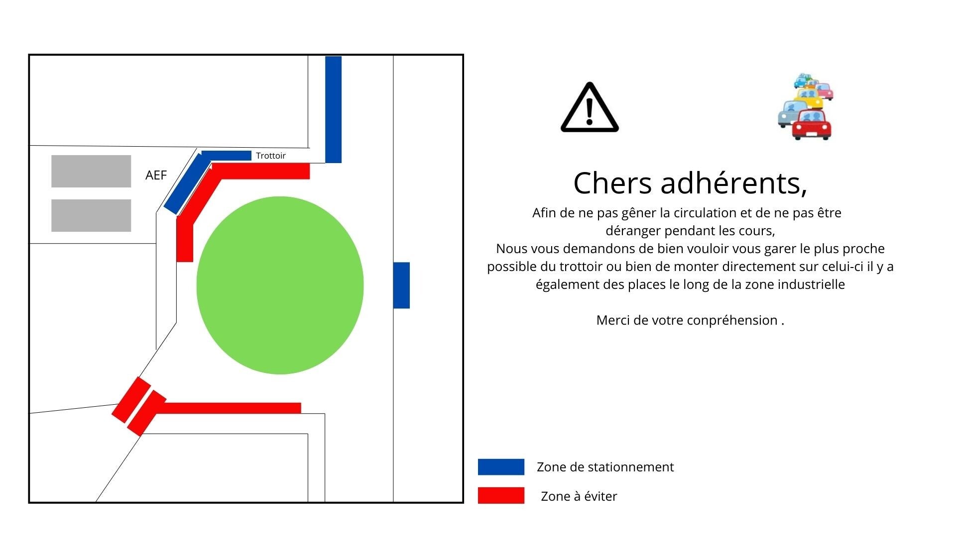Suite à plusieurs incidents impliquant certains usagers professionnels de la route, nous devons mettre en place des mesures afin d’éviter tout désagrément durant nos cours. Il est recommandé de ne pas se garer autour du rond-point. Nous vous invitons également à consulter le plan de stationnement mis à disposition par l’association.